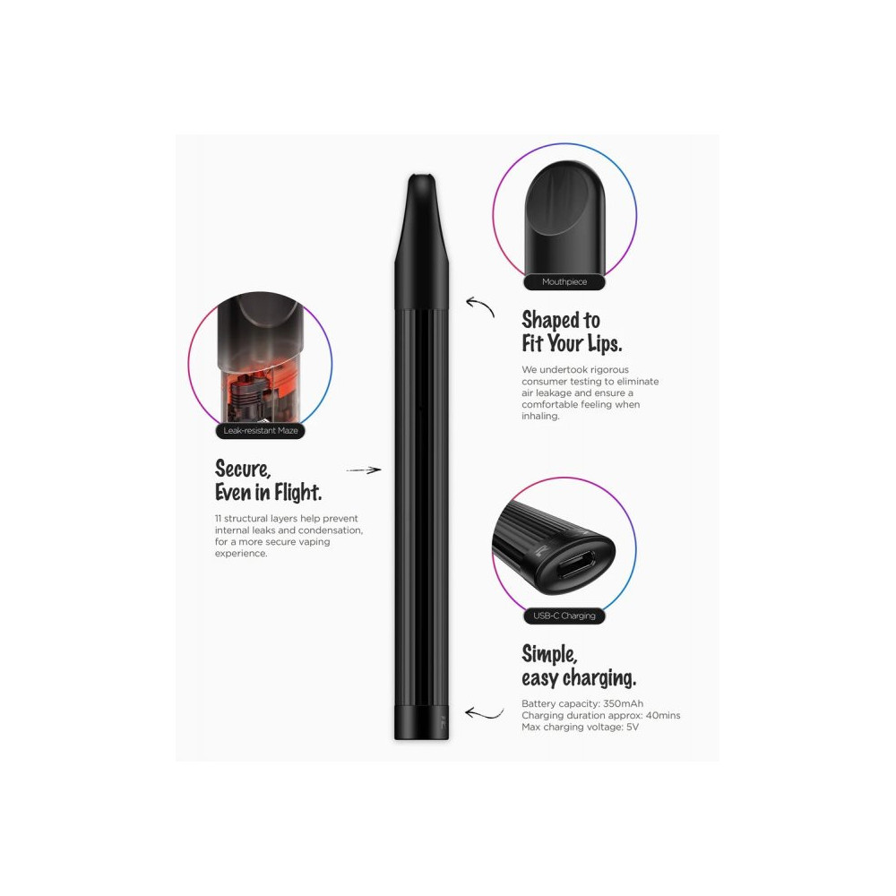 E-cigareta s baterií 350 mAh pro předplněné vyměnitelné cartridge s 1,9 ml liquidu s nikotinovou solí (18 mg nikotinu).