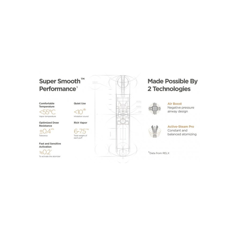 RELX Essential je elektronická cigareta nové generace, která je díky svým vlastnostem nejlepší alternativou ke klasickým cigaretám. Vestavěná baterie o kapacitě 350 mAh disponuje LED indikátorem stavu nabití, automatickým spínačem a USB-C portem pro rychlé nabíjení za pouhých 40 min. Předplněné cartridge obsahují 1,9 ml liquidu s nikotinovou solí o síle nikotinu 18 mg. Oproti obdobným zařízením se elektronická cigareta RELX Essential prezentuje kompaktní velikostí, skvělou kouřivostí a autentickou chutí liquidu. Liquidy SALT se od běžných liquidů odlišují tím, že mají nižší PH a obsahují stále více oblíbenou a žádanou nikotinovou sůl, díky které dochází k rychlejší a kvalitnější vstřebatelnosti = bez dráždivého pocitu v krku oproti klasickým liquidům. V přírodě se tato sůl volně vyskytuje v tabákových listech. Díky tomu tyto liquidy obsahují přirozenou formu nikotinu, který je pro tělo lépe vstřebatelný a nezkresluje chuť liquidu. Velkou výhodou je rychlejší proces odpařování (nikotinová sůl se odpařuje při nižších teplotách) a daleko lepší vstřebatelnost, díky které je intenzita vapování nižší, takže spotřeba těchto liquidů s nikotinovou solí je nižší, než u klasických liquidů na stejném zařízení. Také se tím prodlužuje životnost žhavících hlav a snižuje spotřeba baterie. Tyto liquidy jsou velmi vhodné pro kuřáky, kteří přecházejí z klasických cigaret na elektronické, kdy je nutné, aby nový e-kuřák dostal do těla dostatečné množství nikotinu, bez jakéhokoli dráždivého pocitu (škrábání, kašlání).