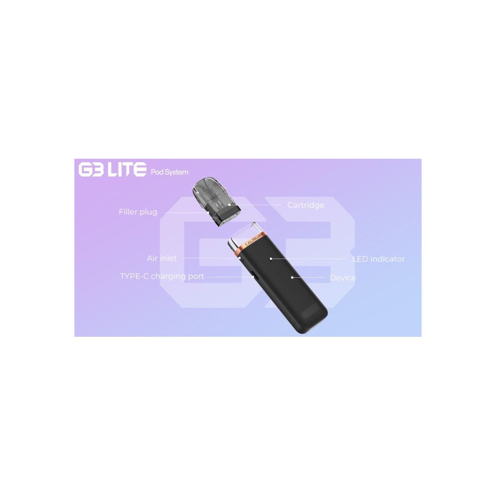 Uwell Caliburn G3 Lite je nízkonákladová elektronická cigareta, která svými vlastnostmi uspokojí i náročnější uživatele. Tělo baterie z odolného materiálu PCTG je vybaveno monočlánkem o kapacitě 1200 mAh s LED indikátorem stavu nabití, automatickým výkonem až 25 W a USB-C portem pro rychlé nabití. Cartridge G3 o objemu 2,5 ml disponují vestavěnou cívkou o odporu 0,6 ohm a 0,9 ohm. Žhavicí hlava má omezenou životnost a je potřeba ji pravidelně vyměňovat (vždy při opotřebení).