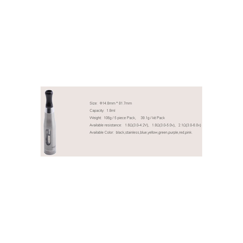 Clearomizer eGo se spodním plněním - MTL. Kompatibilní s bateriemi eGo. Vylepšená verze clearomizeru CE5. Má vnější kovové pouzdro, které zvyšuje odolnost clearomizeru. Okénky je vidět, kolik zbývá uvnitř liquidu. Je osazen žhavicí hlavou s odporem 1,8 ohm (tu je potřeba pravidelně vyměňovat) a pojme až 1,8 ml e-liquidu.