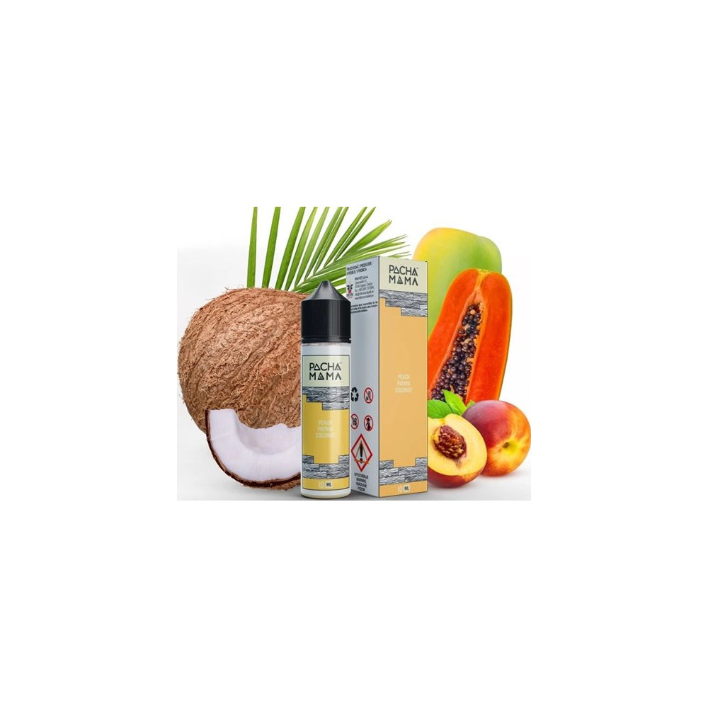 Příchuť Pacha Mama Peach, Papaya, Coconut přináší přesně to, co slibuje název. Lahodná kombinace exotické papaje s krémovou broskví je doplněna jemným kokosovým nádechem.