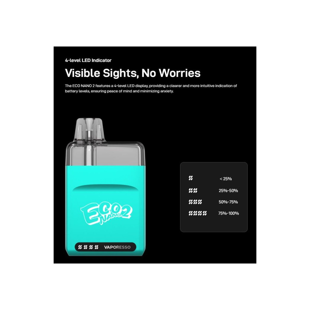 Vaporesso představuje druhé vydání kapesního Vape zařízení ECO Nano 2. Pod stylovým pláštěm baterie se nachází integrovaný monočlánek o kapacitě 1000mAh s rychlým USB-C (1A) nabíjením, AXON čip pro intenzivní vapování a LED displej zobrazující stav nabití baterie. Tvorbu páry zajišťuje systém automatického žhavení - stačí pouze potáhnout z náustku. ECO Nano 2 je vybaveno cartridgí o objemu 6ml s vestavěnou žhavicí hlavou Mesh o odporu 0,6ohm a technologií COREX = rychlejší a vyváženější odpařování liquidu. Žhavicí hlava má omezenou životnost a je potřeba ji pravidelně vyměňovat (vždy při opotřebení).