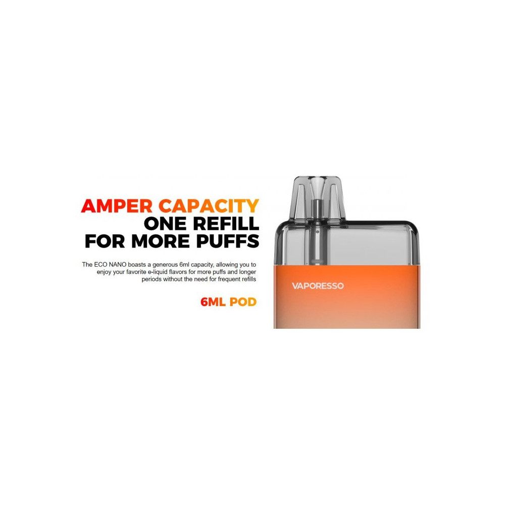 Vaporesso ECO Nano je ultimátní MTL zařízení pro vaping. Velikostí sice patří do skupiny menších POD systémů, avšak díky nadstandardním parametrům nezná konkurenci. Tělo baterie disponuje vestavěným monočlánkem o kapacitě 1000 mAh s rychlým USB-C nabíjením a automatickým výkonem až 16 W. Tvorbu páry zajišťuje systém automatického žhavení - stačí pouze potáhnout z náustku. To, co dělá ECO Nano vyjímečným, je beze slova cartridge o objemu 6 ml s vestavěnou žhavicí hlavou Mesh o odporu 0,8 ohm a technologií COREX = rychlejší a vyváženější odpařování liquidu. Žhavicí hlava má omezenou životnost a je potřeba ji pravidelně vyměňovat (vždy při opotřebení).