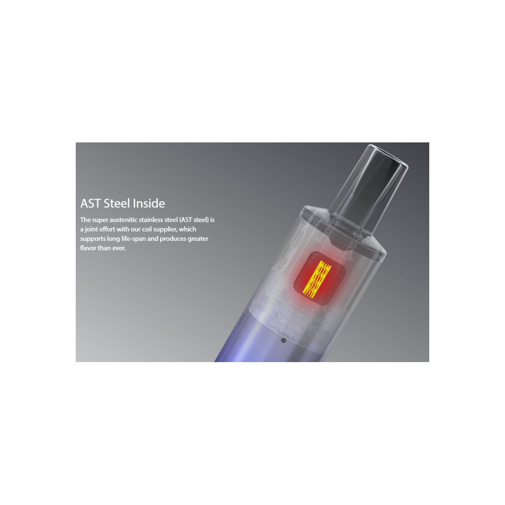 Joyetech eGo AIO AST Pod patří do tzv. skupiny kapesních elektronických cigaret, jejichž výhodou jsou kompaktní rozměry, autentické podání chuti a nízká pořizovací cena. Tělo baterie disponuje zabudovaným monočlánkem o kapacitě 1000mAh s automatickým spínačem a konstantním napětím pro stabilní výkon. Čip AVATAR IC 1.0 přináší ochranu proti zkratu, přehřátí a vybití, či 8 vteřinovou ochranu žhavení. Vyměnitelná cartridge (POD) se žhavící hlavou o odporu 1ohm pojme až 2ml liquidu. Nabíjení umožňuje micro USB vstup. Tato inovace je vhodná pro kouření ve stylu MTL, tedy klasického šlukování pusa-plíce.