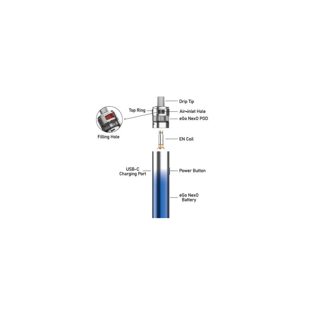 eGo NexO je nová řada elektronických cigaret s POD systémem od společnosti Joyetech, která je vybavena 1500 mAh monočlánkem a cartridgí o objemu 2 ml s uživatelsky přívětivým 360 stupňovým oknem pro kontrolu stavu liquidu. Zařízení dále disponuje automatickým výkonem až 20 W, LED indikátorem stavu nabití baterie, USB-C portem pro rychlé nabití a vyměnitelnými atomizery řady EN. Žhavicí hlava má omezenou životnost a je potřeba ji pravidelně vyměňovat (vždy při opotřebení).