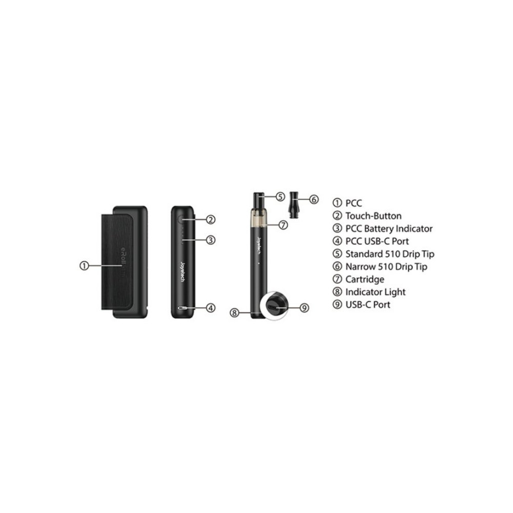 Joyetech eRoll Slim je elegantně zpracovaná elektronická cigareta, která je dokonale sladěná s PPC pouzdrem. Tato již legendární e-cigareta disponuje baterií 480 mAh, barevným LED indikátorem stavu nabití, vyměnitelnou cartridgí o objemu 2 ml se žhavicí hlavou Mesh o odporu 1 ohm a náustky typu 510 standard a narrow pro MTL vaping. PCC pouzdro o kapacitě monočlánku 1500 mAh zpodobňuje půvabné spojení kovu a kůže. Po vložení e-cigarety do PCC pouzdra dojde k nadčasovému magnetickému propojení a následnému dobíjení baterie e-cigarety. PCC pouzdro i samostatná e-cigareta lze dobíjet i samostatně přes USB-C port, a díky indikátoru stavu nabití se sami rozhodnete, kdy je ten pravý čas na dobití. Žhavicí hlava má omezenou životnost a je potřeba ji pravidelně vyměňovat (vždy při opotřebení).
