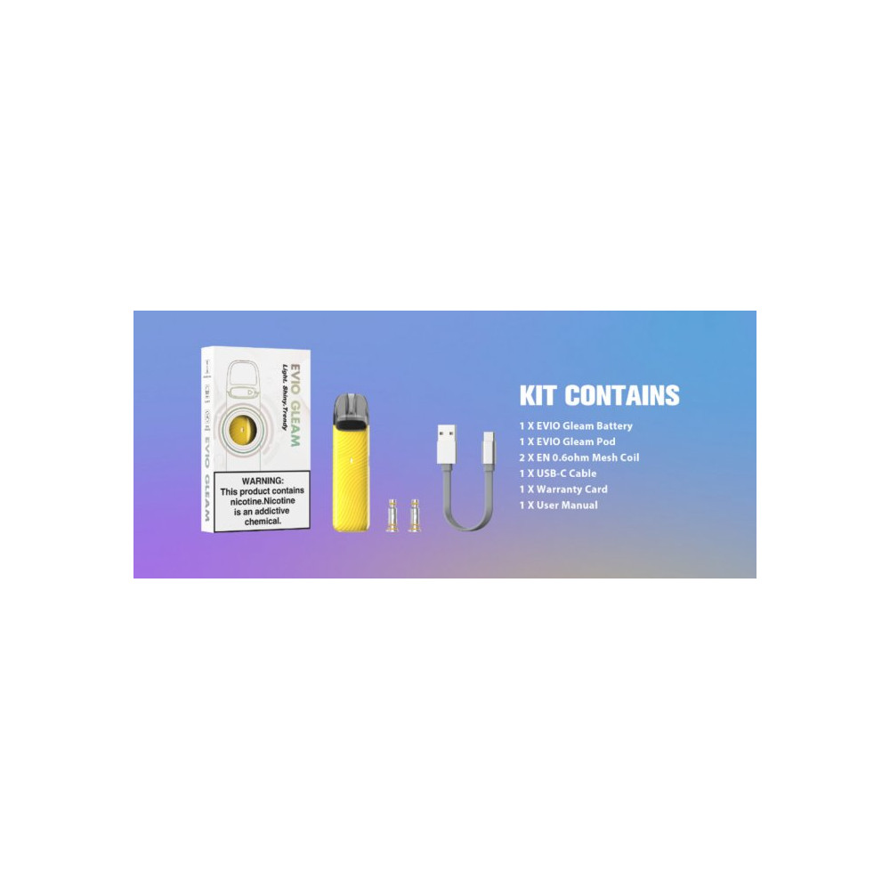 Joyetech EVIO Gleam je elegantní elektronická cigareta s hladkým povrchem a křišťálově čistým vzhledem. Integrovaný monočlánek o kapacitě 900 mAh disponuje LED indikátorem stavu nabití, automatickým výkonem až 20 W a USB-C portem pro rychlé nabíjení. Cartridge (POD) s vyměnitelným atomizerem řady EN nabízí pohodlné vrchní plněním o objemu až 2 ml. Výrobce si připravil pro tuto e-cigaretu novou Mesh spirálku o odporu 0,6 ohm. Žhavicí hlava má omezenou životnost a je potřeba ji pravidelně vyměňovat (vždy při opotřebení).