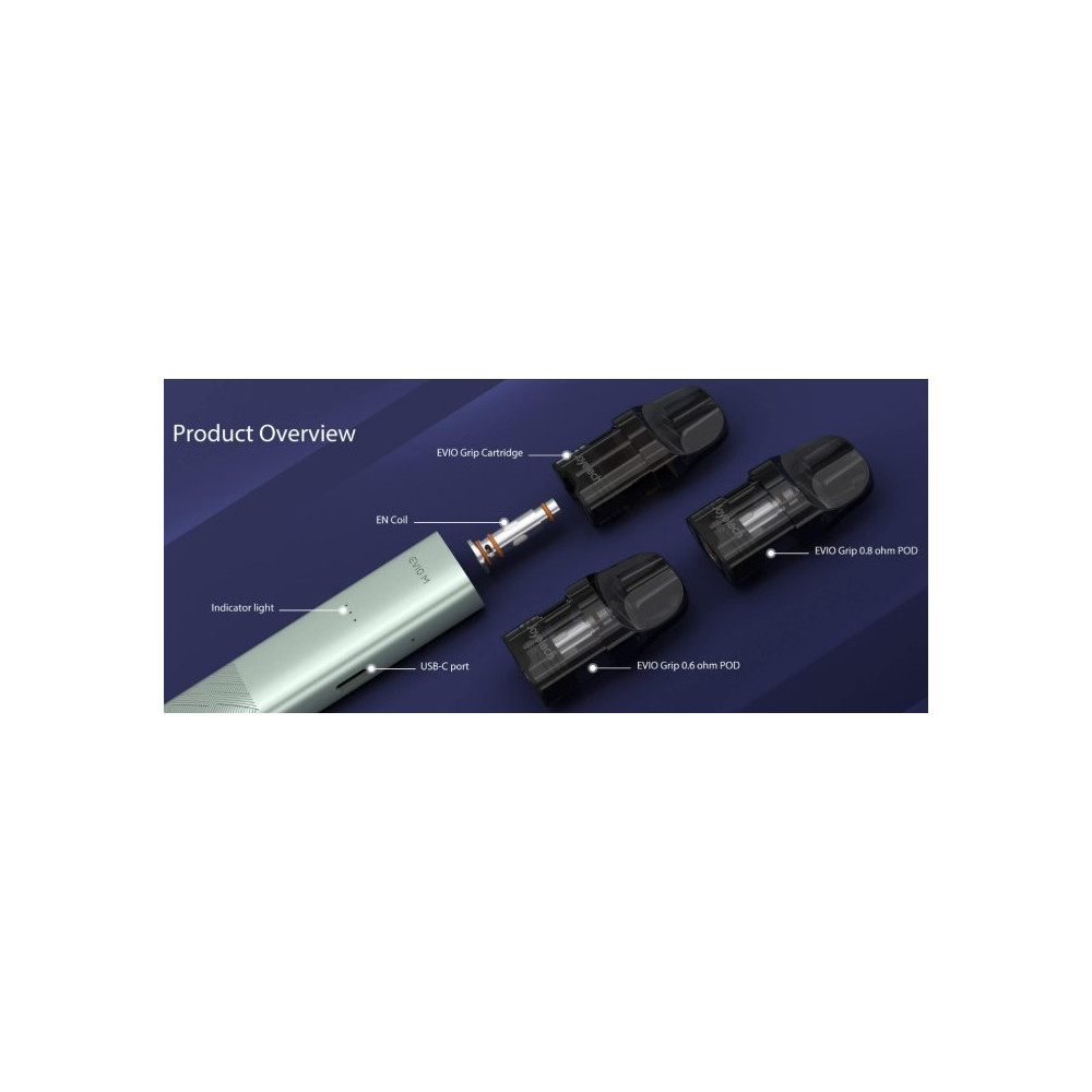 Elektronická cigareta Joyetech EVIO M Pod je novým přírůstkem do rodiny Joyetech EVIO s kapacitou cartridge 2,8 ml, dobíjecí baterií 900 mAh s indikátorem stavu nabití a automatickým výkonem až 20 W. Tento všestranný podsystém je navržený tak, aby byl dokonalým společníkem pro každodenní vapování. Vyměnitelná cartridge (POD) s vestavěným atomizerem o odporu 0,8 ohm pojme až 2,8 ml liquidu. K dispozici je také cartridge o odporu 0,6 ohm nebo s vyměnitelným atomizerem řady EN. Žhavicí hlava má omezenou životnost a je potřeba ji pravidelně vyměňovat (vždy při opotřebení).
