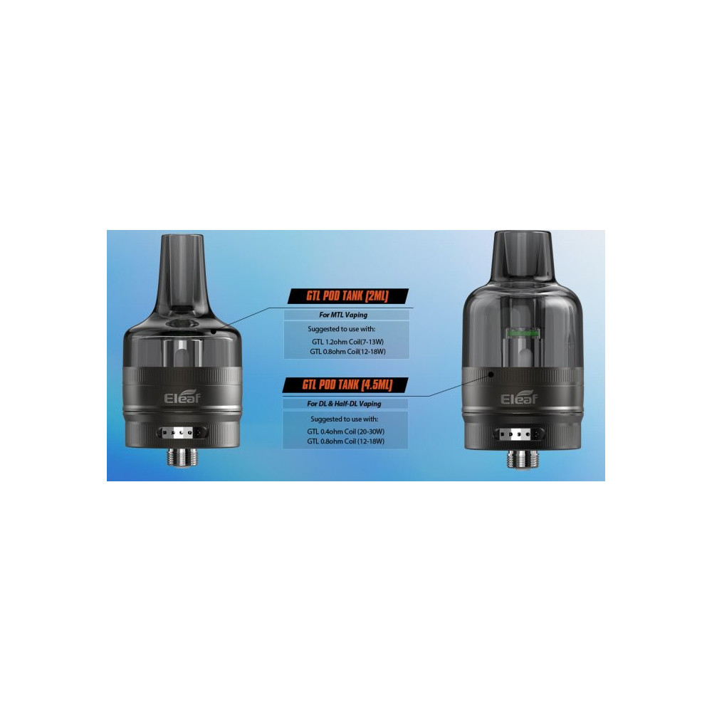 Clearomizer GTL Pod s klasickým 510 závitem je praktický clearomizer od společnosti Eleaf. Plastové tělo PCTG se základnou z nerez oceli pojme až 4,5ml liquidu a je vhodný pro DL vaping. V základním balení budete mít na výběr dvě žhavicí hlavy, a to GTL o odporu 0,4ohm a 0,8ohm. Regulace přívodu vzduchu pro nastavení optimální kouřivosti se nachází ve spodní části.