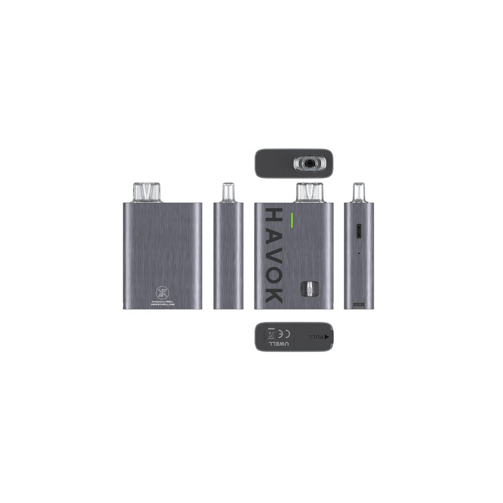 Elektronická cigareta Uwell Havok R se vyznačuje svým neotřelým designem a hlavně inovativní instalací cartridge, která se vkládá zespodu těla baterie = zamezení protečení liquidu. Vestavěný monočlánek o kapacitě 950 mAh s automatickým výkonem až 22 W, LED indikátor stavu nabití a USB-C port pro rychlé nabití. Cartridge Havok R o objemu 3 ml disponuje integrovanou žhavicí cívkou o odporu 0,6 ohm. Žhavicí hlava má omezenou životnost a je potřeba ji pravidelně vyměňovat (vždy při opotřebení).