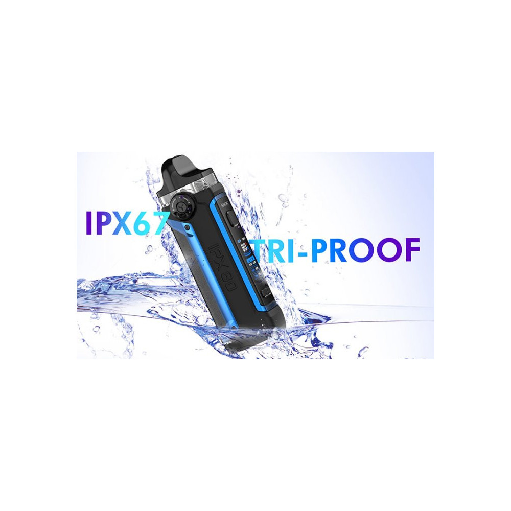 Smoktech IPX 80 je kombinací odolného gripu a výkonného POD systému. Odolnost IP67 zaručuje odolnost vůči nechtěným pádům a vniknutí vody či prachu do zařízení. Integrovaná baterie o kapacitě 3000mAh disponuje nastavitelným výkonem až 80W. Ergonomické tělo z nerez oceli a kůže zdobí 0,96 palcový displej, který umožňuje jednoduché nastavení hodnot a zobrazuje všechny potřebné informace. Baterii lze jednoduše nabít pomocí USB-C portu, který poskytuje rychlé nabíjení. Mezi jeho další přednosti patří ochrana proti zkratu, přehřátí a podbití, či 8-mi vteřinová ochrana žhavení. IPX 80 nabízí cartridge pro žhavicí hlavy RPM 2 s jednoduchým bočním plněním o objemu 5,5ml. Na boční straně gripu najdete kolečko pro optimální nastavení přívodu vzduchu.