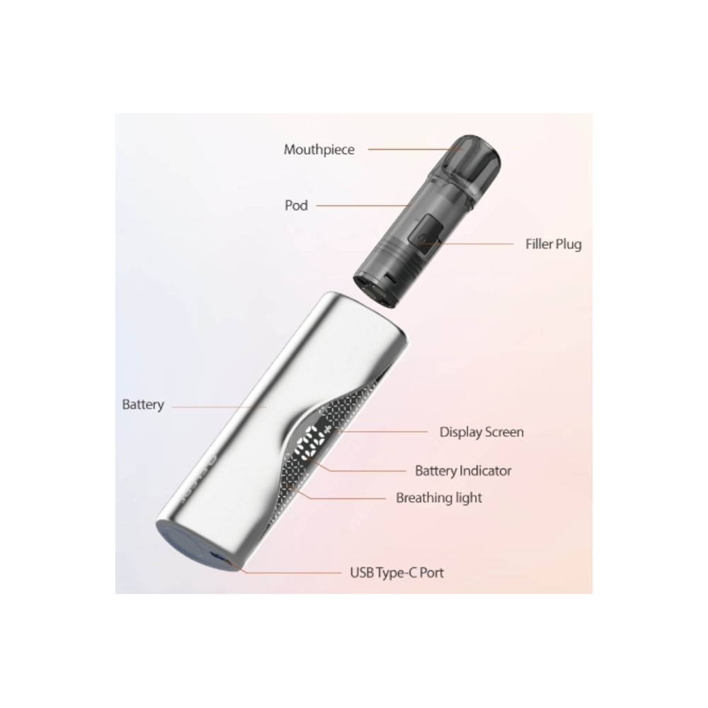 Elektronická cigareta s POD systémem. Kapacita baterie je 850 mAh, výkon až 15 W. Prázdné cartridge s vestavěnou žhavicí hlavou mají kapacitu až 2 ml a jsou opětovně plnitelné nebo lze používat i přednaplněné cartridge ELF BAR ELFA nebo LOST MARY TAPPO Pods. Pro vaping ve stylu MTL.