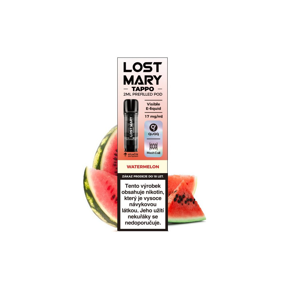 Naplněná cartridge LOST MARY TAPPO obsahuje 2 ml liquidu o síle nikotinu 17 mg. Cartridge jsou naplněny prémiovým liquidem s nikotinovou solí, díky které dochází k rychlejšímu a kvalitnějšímu vstřebávání bez dráždivého pocitu v krku oproti klasickým liquidům. Nedílnou součástí cartridge je spirálka Mesh QUAQ, která kombinuje ultra jemnou síťovinu s vysoce absorpční bavlnou. Poměr 50 VG / 50 PG.