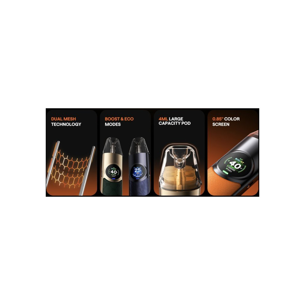 Součástí zařízení je velkokapacitní 4 ml cartridge, která umožňuje více než 15 naplnění a disponuje 5vrstvou ochranou proti úniku, což zaručuje spolehlivý a čistý provoz. Přehledný 0,85" barevný displej poskytuje snadný přístup ke všem nastavením zařízení a zobrazuje důležité informace. Integrovaná 1500 mAh baterie s rychlým nabíjením 5V / 2A zajišťuje dlouhou výdrž a rychlé doplnění energie. Kromě toho zařízení umožňuje nastavení výkonu v rozmezí 5 – 40 W, díky čemuž si každý uživatel může přizpůsobit zážitek z vapování podle svých preferencí.