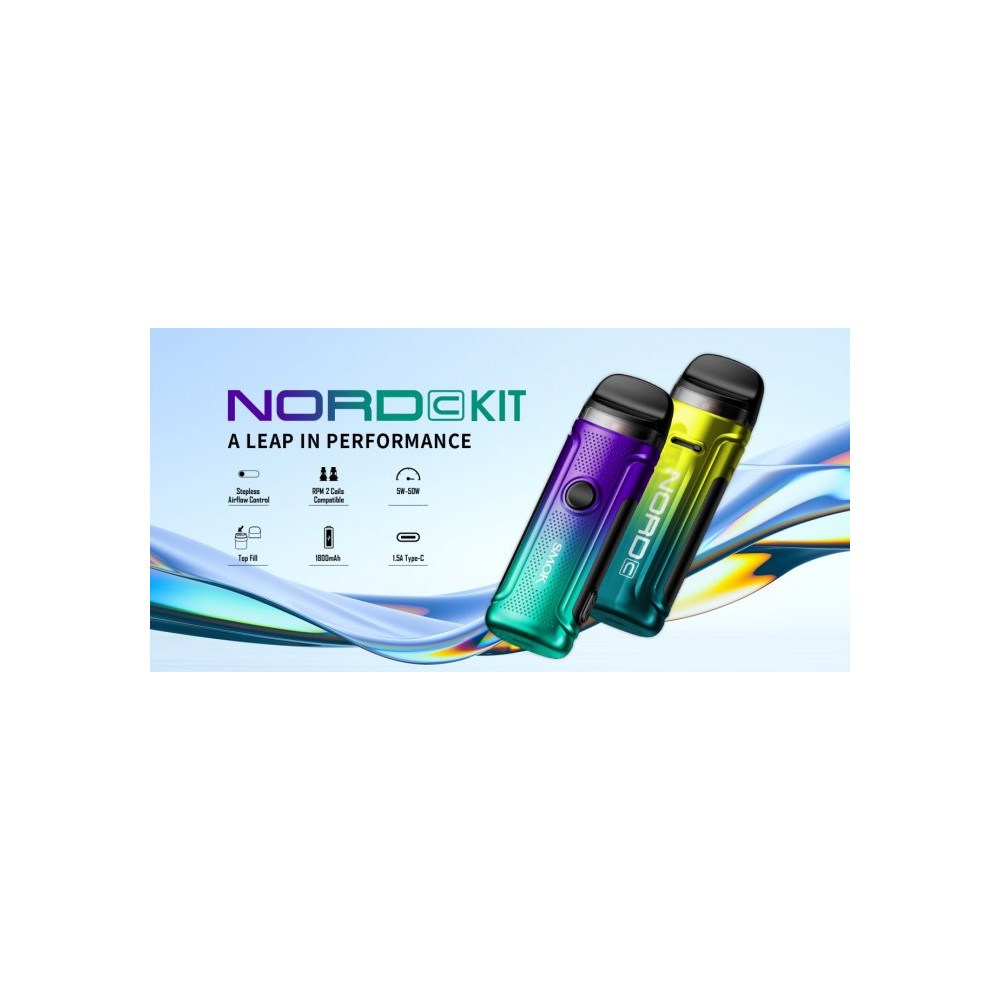 Smoktech si pro Vás připravil zbrusu nový model elektronické cigarety NORD C, který vás na první pohled zaujme svým futuristickým zpracováním. S tímto "parťákem" si na cestě vapingu užijete nepřekonatelný DL zážitek za doprovodu té nejlepší chuti liquidu. Kompaktní tělo baterie přináší vestavěný monočlánek o kapacitě 1800 mAh, nastavitelný výkon až 50 W, inovativní regulaci přívodu vzduchu AFC a rychlé nabíjení pomocí USB-C portu. Na boční straně je umístěn OLED displej, který umožňuje jednoduché nastavení hodnot a zobrazuje všechny potřebné informace. Mezi jeho další přednosti patří ochrana proti zkratu a přehřátí či 8 vteřinová ochrana žhavení. Cartridge Nord C o objemu 4,5 ml spolupracuje se žhavicími hlavami RPM 2. Žhavicí hlava má omezenou životnost a je potřeba ji pravidelně vyměňovat (vždy při opotřebení).