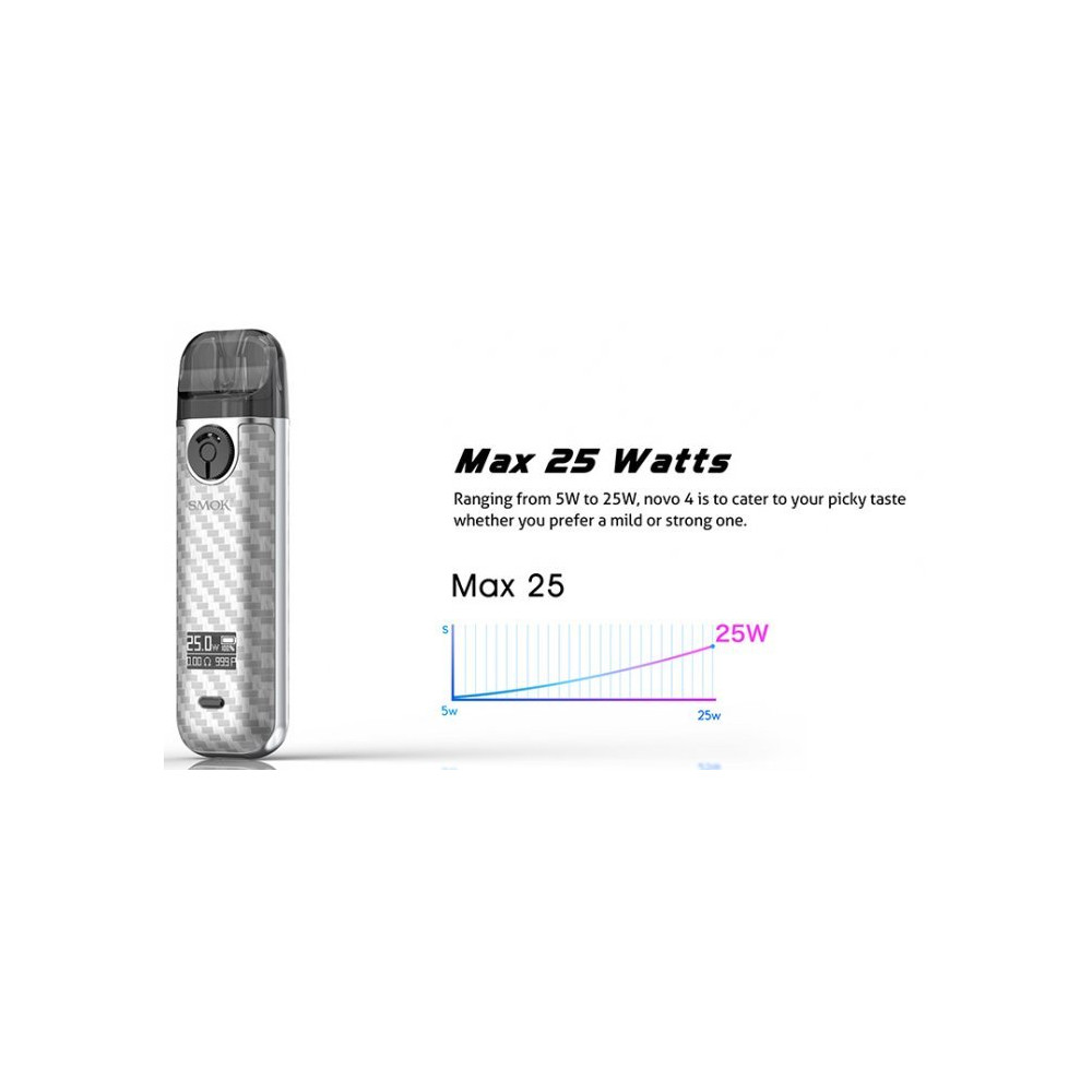 Série elektronických cigaret Smoktech Novo se představuje již ve své čtvrté verzi, která se může pyšnit moderním designem, lepší kouřivostí a novými žhavícími hlavami LP. Cartridge o objemu 2ml jsou dodávány v černé barvě, ale pro lepší přehled stavu liquidu nebo barevnou kombinaci s tělem baterie lze dokoupit i transparentní barvu. Žhavicí hlavy LP nabízí výrobce ve třech provedení, a to: DC MTL 0,8ohm a Meshed o odporech 0,8ohm a 1,2ohm. Kompaktní tělo baterie disponuje vestavěným monočlánkem o kapacitě 800mAh s nastavitelným výkonem až 25W, automatickým i manuálním spínačem a 0,49palcovým displej, který umožňuje jednoduché nastavení hodnot a zobrazuje všechny potřebné informace. Nabíjení zajišťuje USB-C vstup.