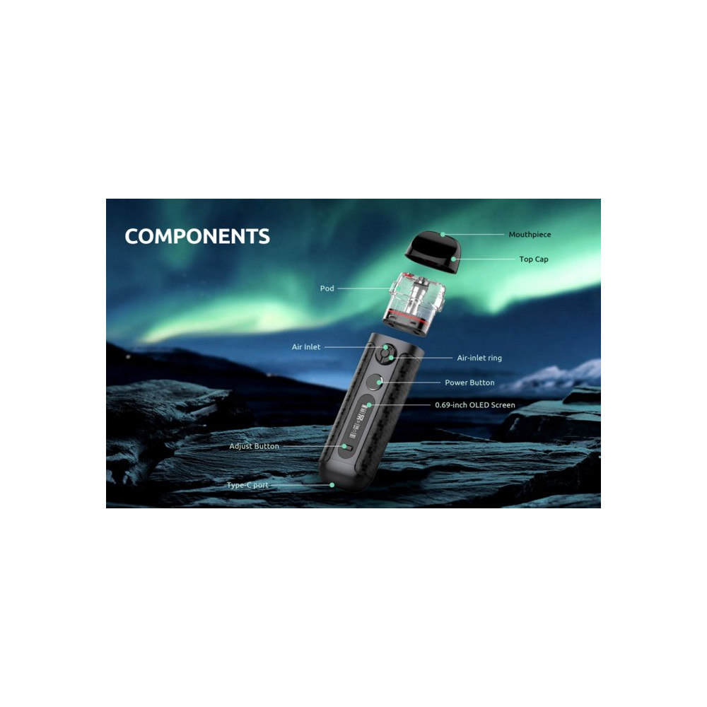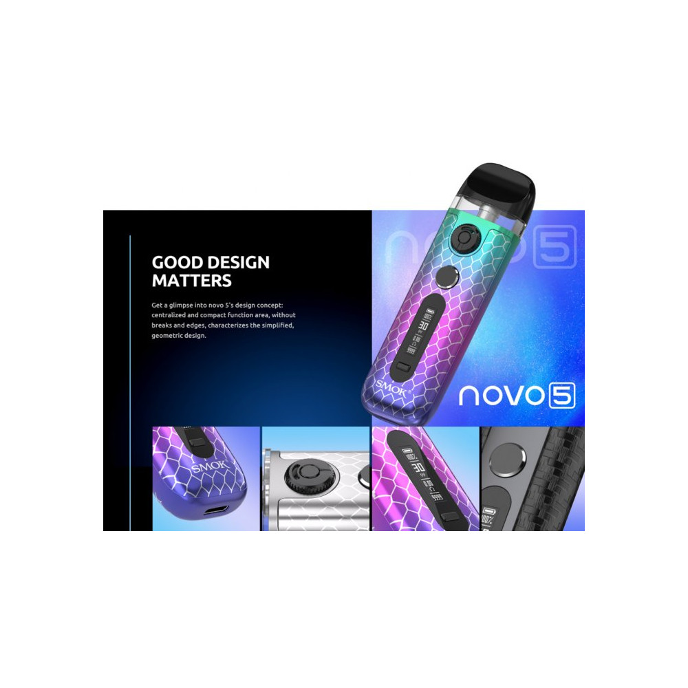 Krásný na povrchu, silný zevnitř - stručná, ale výstižná charakteristika elektronické cigarety Smoktech Novo 5. Kompaktní tělo baterie přináší vestavěný monočlánek o kapacitě 900 mAh, nastavitelný výkon až 30 W, inovativní regulaci přívodu vzduchu a rychlé nabíjení pomocí USB-C portu. Na přední straně je umístěn OLED displej, který umožňuje jednoduché nastavení hodnot a zobrazuje všechny potřebné informace. Tvorbu páry zajišťuje nejen spínací tlačítko, ale i systém automatického žhavení - stačí pouze potáhnout z náustku. Vyměnitelná cartridge (POD) se žhavicí hlavou o odporu 0,7 ohm pojme až 2 ml liquidu. Žhavicí hlava má omezenou životnost a je potřeba ji pravidelně vyměňovat (vždy při opotřebení).