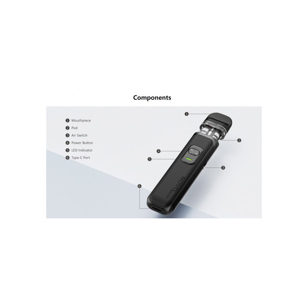 Elektronická cigareta NOVO MASTER je flexibilní zařízení pro skvělý zážitek z vapingu. Dokonale zpracované tělo baterie disponuje integrovaným monočlánkem o kapacitě 1000 mAh s rychlým USB-C nabíjením, LED indikátorem stavu nabití a výkonem až 30 W. NOVO MASTER nabízí dva režimy vapování - Boost (intenzivní chuť liquidu) a standard (jemná chuť liquidu). Tvorbu páry zajišťuje nejen spínací tlačítko, ale i systém automatického žhavení - stačí pouze potáhnout z náustku. Cartridge Novo s vrchním plněním o objemu 2 ml se představují ve verzi Mesh o odporu 0,6 ohm a 0,8 ohm. Plně kompatibilní i s cartridgemi Novo 2. Žhavicí hlava má omezenou životnost a je potřeba ji pravidelně vyměňovat (vždy při opotřebení).