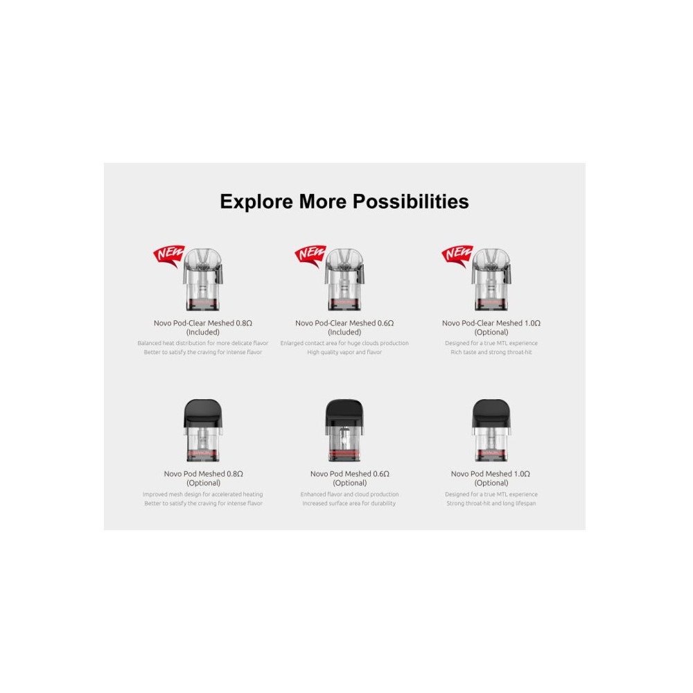 Smoktech NOVO Pro je vysoce výkonná řada elektronických cigaret s poutavým vzhledem a profesionálními funkcemi. Baterie s integrovaným monočlánkem o kapacitě 1300 mAh nabízí dva aktivační režimy pro flexibilnější způsob vapování. Přehledný 0,42 palcový OLED displej zobrazuje veškeré potřebné informace o nastavení včetně výstupního výkonu, který dosahuje až 30 W. Cartridge Novo Clear s vrchním plněním o objemu 3 ml se představují ve verzi Mesh o odporu 0,6 ohm a 0,8 ohm. Tyto cartridge jsou plně kompatibilní s cartridgemi Novo 2. Postranní airflow je regulován pomocí speciální páčky, která vám umožní si vzduch nastavit přesně podle Vaší chuti. Žhavicí hlava má omezenou životnost a je potřeba ji pravidelně vyměňovat (vždy při opotřebení).