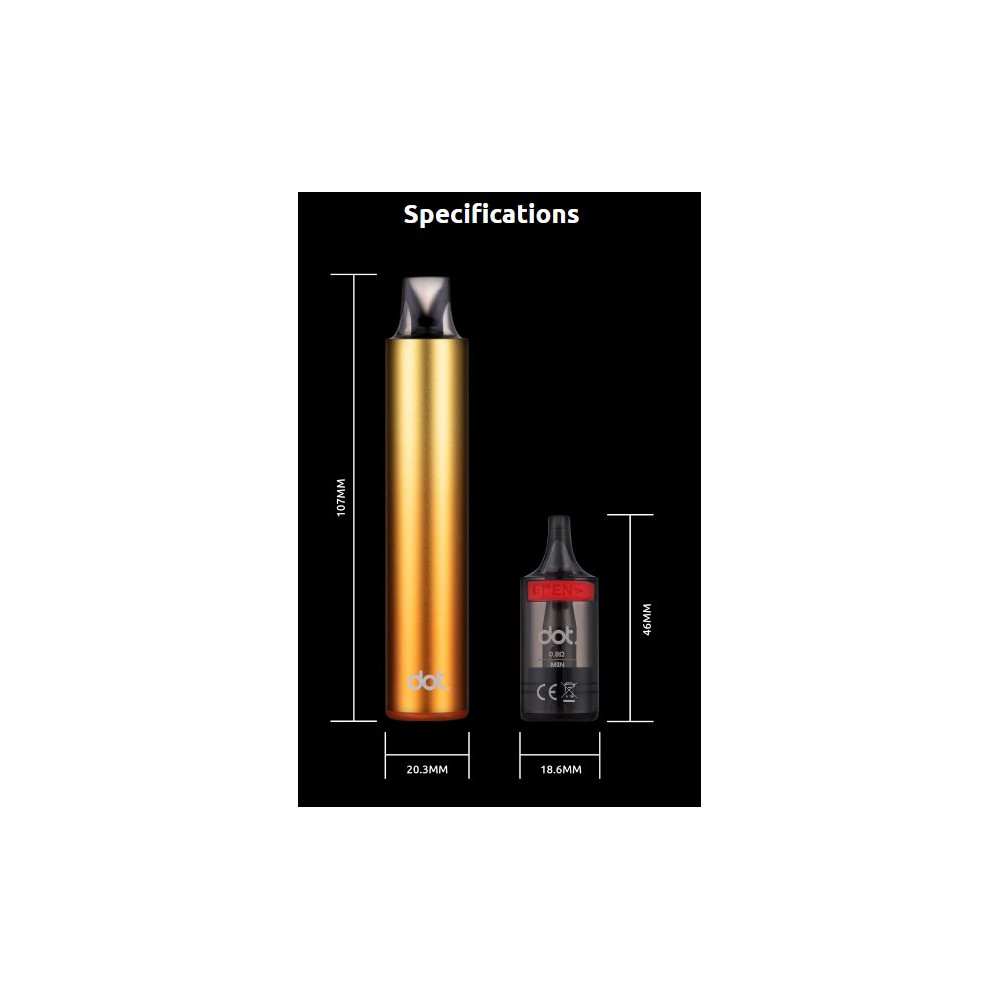 Elektronická cigareta DotMod Switch R je ideální vapovací zařízení ve stylu pera pro začátečníky, kteří hledají jednoduchost bez kompromisů v kvalitě vapingu. Tělo baterie je vyrobeno z kvalitního hliníku a disponuje vestavěným monočlánkem o kapacitě 1000mAh s rychlonabíjením typu USB-C a automatickým výkonem až 25W. Vyměnitelná cartridge (POD) je vybavena žhavící hlavou o odporu 0,8ohm s objemem nádržky 3ml. Díky magnetickému propojení s baterií lze cartridge jednoduše vyjmout a doplnit oblíbeným liquidem. Regulace přívodu vzduchu pro nastavení optimální kouřivosti se nachází ve spodní části těla baterie. Žhavicí hlava má omezenou životnost a je potřeba ji pravidelně vyměňovat (vždy při opotřebení).