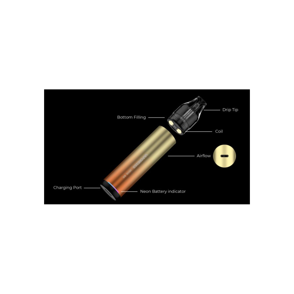 Elektronická cigareta Vaporesso VECO GO je perfektní vapovací zařízení ve stylu pera pro začátečníky, kteří hledají jednoduchost bez kompromisů v kvalitě vapingu. Elegantní a stylový design baterie disponuje vestavěným monočlánkem o kapacitě 1500 mAh s rychlonabíjením typu USB-C 5V/2A a automatickým výkonem až 25 W. Vyměnitelná cartridge (POD) je vybavena žhavicí hlavou o odporu 0,6 ohm a 0,8 ohm s objemem nádržky 5 ml. Díky magnetickému propojení s baterií lze cartridge jednoduše vyjmout a doplnit oblíbeným liquidem. VECO GO využívá technologii zahřívání spirálky COREX, která zajišťuje přesné podání chuti a delší životnost. Magnetická podložka umožňuje regulaci proudění vzduchu pro optimální nastavení. Žhavicí hlava má omezenou životnost a je potřeba ji pravidelně vyměňovat (vždy při opotřebení).