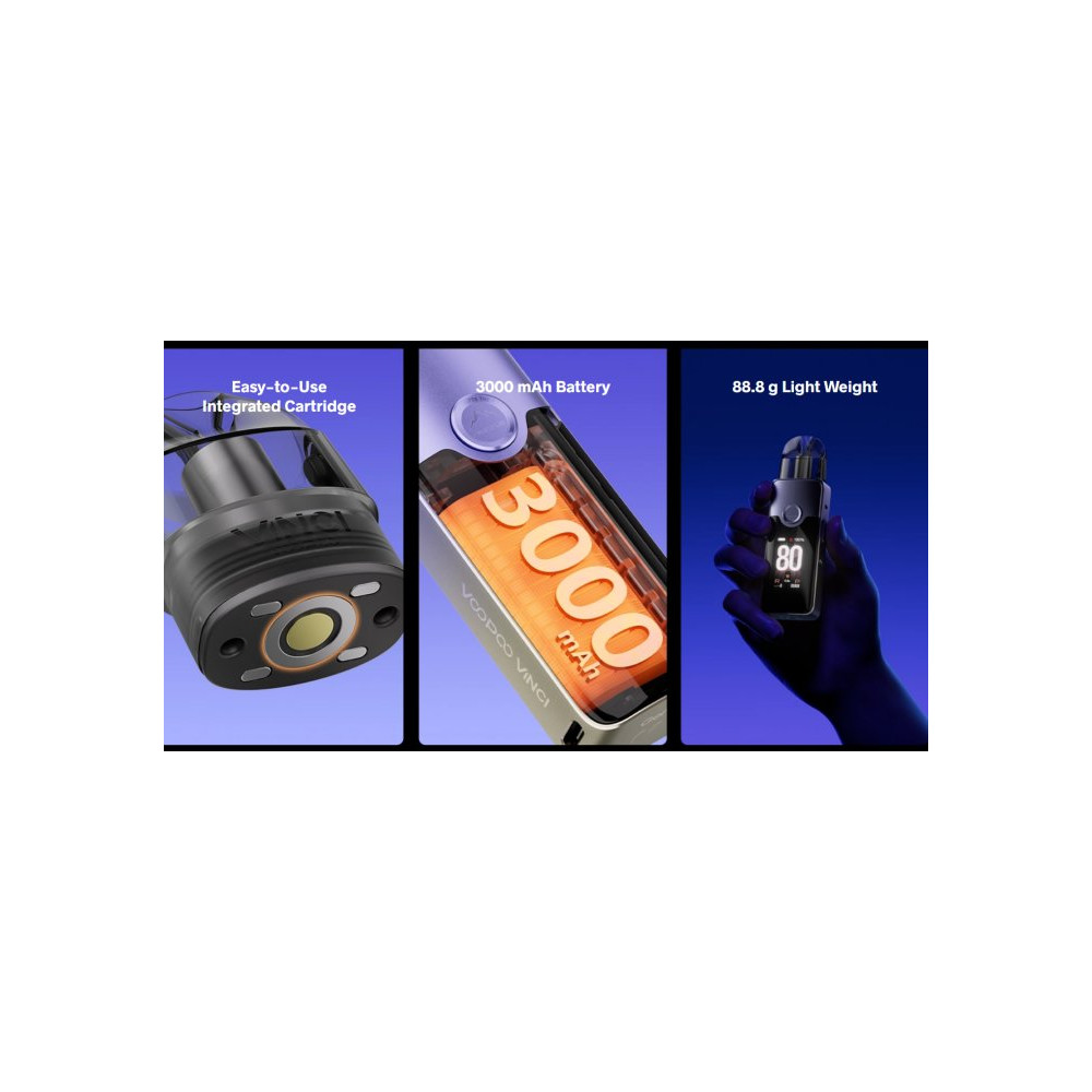 Sada VOOPOO VINCI E80 kombinuje vysoký výkon s uživatelsky přívětivým designem, díky čemuž je ideální jak pro úplné začátečníky, tak i zkušené vapery. Díky masivní vestavěné baterii o kapacitě 3000 mAh poskytuje zařízení až 80 W nastavitelného výkonu pro optimální zážitek z DTL a MTL vapování. Nová cartridge VINCI E má objem 5 ml. E80 je vyrobena z odolné hliníkové slitiny a vybavena TFT 1,47 palcovým displejem, takže vyvažuje funkčnost s přenosností. Žhavicí hlava má omezenou životnost a je potřeba ji pravidelně vyměňovat (vždy při opotřebení).
