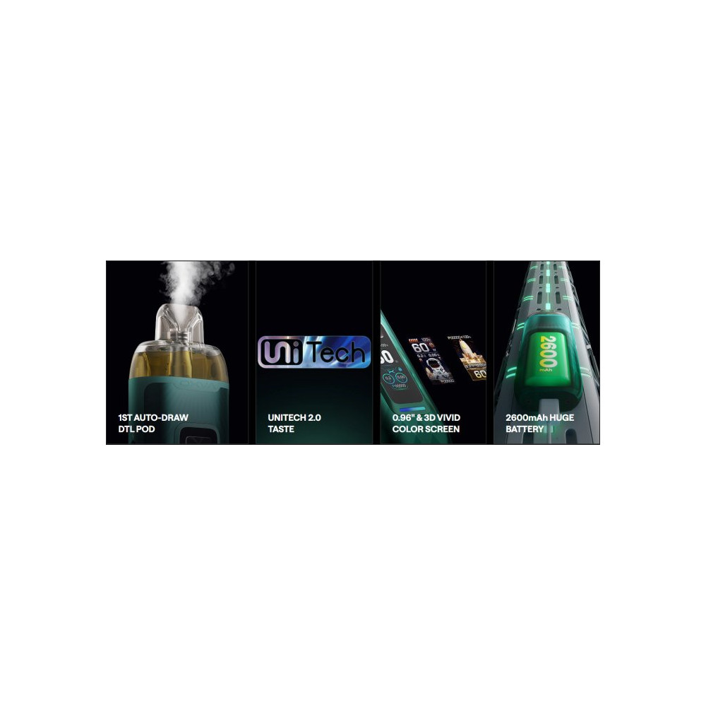 První systém i pro DL s automatickým spínáním potahu. Vestavěný monočlánek má kapacitu 2600 mAh a výstupní výkon až 60W. Cartridge s vestavěnou žhavicí hlavou pojme až 5 ml e-liquidu.