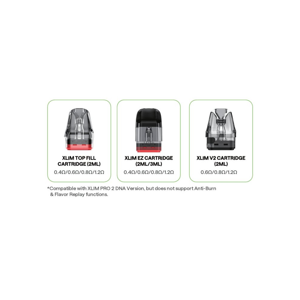 Cartridge Xlim Top Fill SS (Stainless Steel) s vrchním plněním, které pojmou až 2 ml liquidu. Určené primárně pro OXVA XLIM PRO 2 DNA, ale jsou plně kompatibilní se všemi zařízeními OXVA XLIM (Xlim GO, Xlim Classic Edition, Xlim Pro, Xlim Pro 2, Xlim SQ Pro, Xlim SQ Pro 2).Žhavicí hlava má omezenou životnost a je potřeba ji pravidelně vyměňovat (vždy při opotřebení).