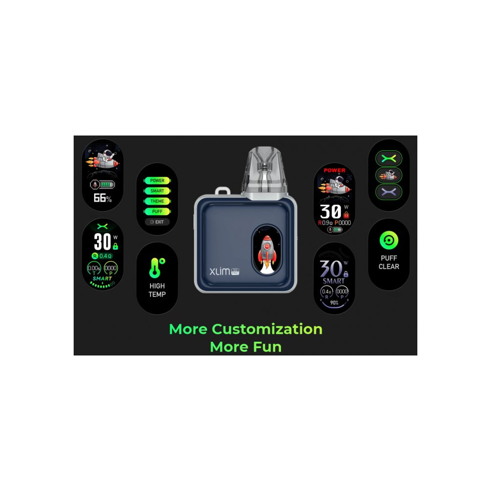 Elektronická cigareta OXVA Xlim SQ Pro je zárukou dokonalého vapingu! Moderně zpracované tělo baterie je pokryto technologií IML (In Mold Labeling) = vícevrstvá fólie zalitá plastem, opticky téměř nerozeznatelná od výrobků z pravého kovu, ovšem s výhodami plastu. Integrovaný monočlánek o kapacitě 1200 mAh disponuje rychlým USB-C nabíjením. Přední panel je obohacen o 0,96 palcový barevný TFT displej (Thin Film Transistor) pro snadné nastavení a zobrazení hodnot včetně zábavné tapety displeje. OXVA Xlim SQ Pro nabízí režimy Power a Smart o maximálním výkonu až 30 W. Tvorbu páry zajišťuje systém automatického žhavení - stačí pouze potáhnout z náustku. Na boční straně baterie je umístěno regulační tlačítko pro přívod vzduchu, díky kterému si jednoduše nastavíte RDL nebo MTL režim vapování. V obsahu balení nalezneme cartridge Xlim V3 s bočním plněním. Lze však použít i cartridge Xlim V2. Žhavicí hlava má omezenou životnost a je potřeba ji pravidelně vyměňovat (vždy při opotřebení).