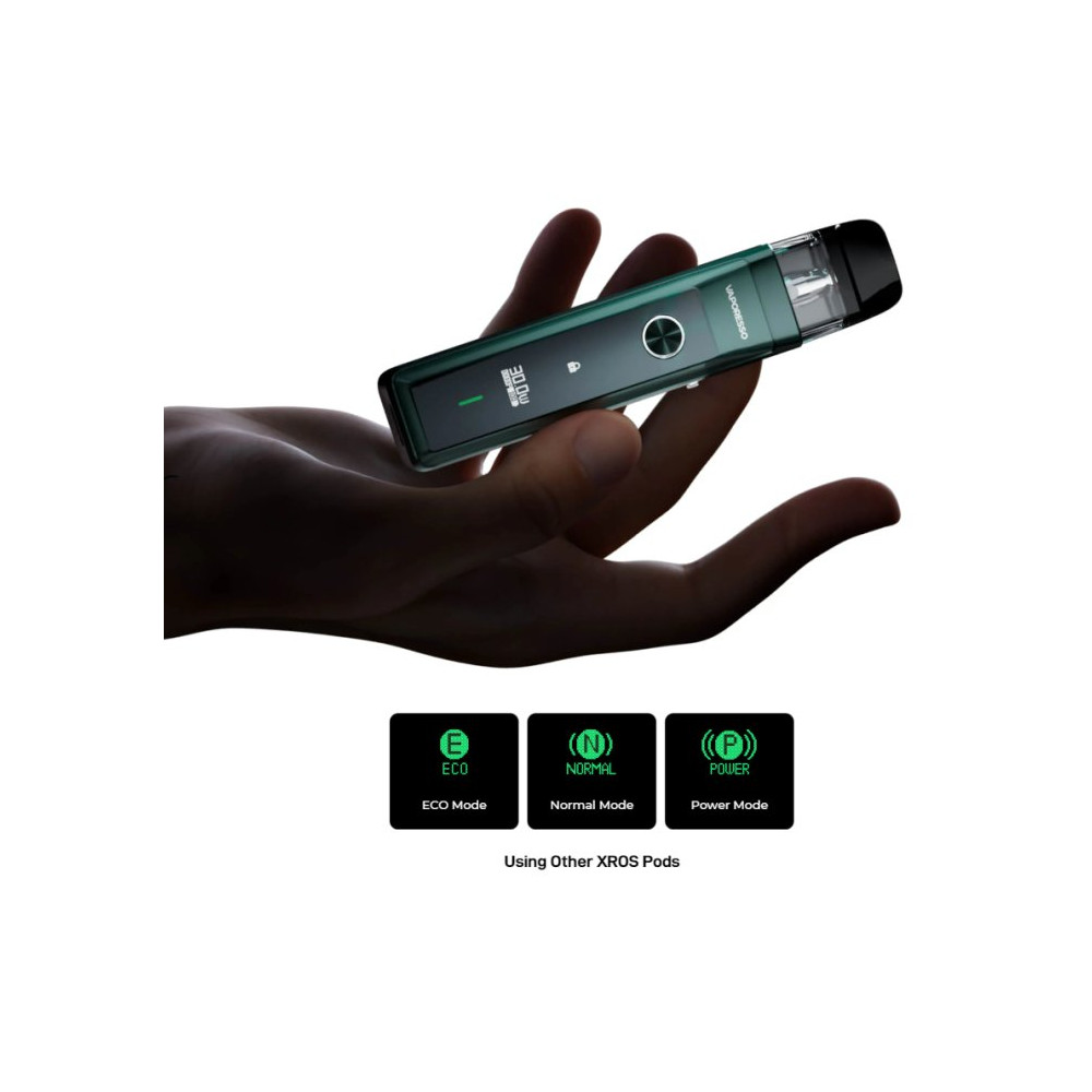 XROS PRO je nejpropracovanější a nejvýkonnější elektronická cigareta řady XROS od Vaporessa. Důmyslně zpracované tělo baterie disponuje monočlánkem o kapacitě 1200 mAh, moderním displejem a především čipem AXON, který nabízí režimy Super Pulse (stálý výkon bez ohledu na stavu nabití baterie), ECO, Normal a Power s výkonem až 30 W. XROS PRO je osazena cartridge s vrchním plněním, objemem nádržky 3 ml a Mesh spirálkou o odporu 0,4 ohm. Tato cartridge je vybavena technologií COREX Heating Tech - příjemný vaping v kombinaci husté páry a vyladěné chuti liquidu. Cartridge je plně kompatibilní s předešlými modely. Žhavicí hlava má omezenou životnost a je potřeba ji pravidelně vyměňovat (vždy při opotřebení).